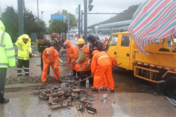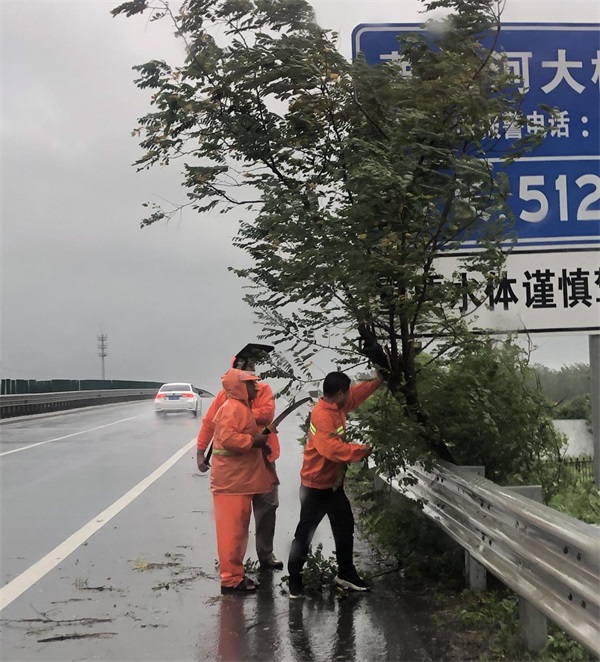由于“煙花”臺風影響,公司管養(yǎng)道路發(fā)生多處路樹倒伏,橙色突擊隊應急搶修人員發(fā)揮連續(xù)作戰(zhàn)精神,無懼風雨,連夜趕赴現場,迅速清理倒伏樹木,確保路面暢通。對于地勢低洼路段積水嚴重情況,養(yǎng)護應急人員火速將抽水泵運到現場,開足馬力抽水排水,同時及時疏通排水溝、涵洞,搶抓時間及時修補路面坑塘,第一時間消除道路安全隱患,確保公司管養(yǎng)道路安全暢通。