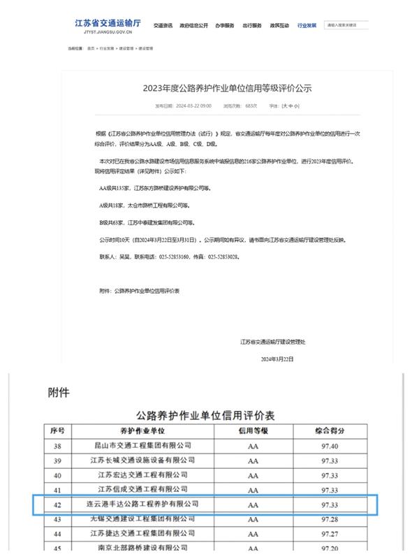 近日,經(jīng)省交通運(yùn)輸廳2023年度公路養(yǎng)護(hù)作業(yè)單位信用等級評價(jià),豐達(dá)公司成功榮獲公路養(yǎng)護(hù)作業(yè)單位信用評價(jià)AA等級。這是繼上周榮獲江蘇省2023年度施工信用評價(jià)AA級后,再次被評定為AA信用評級(首次),實(shí)現(xiàn)雙評級。