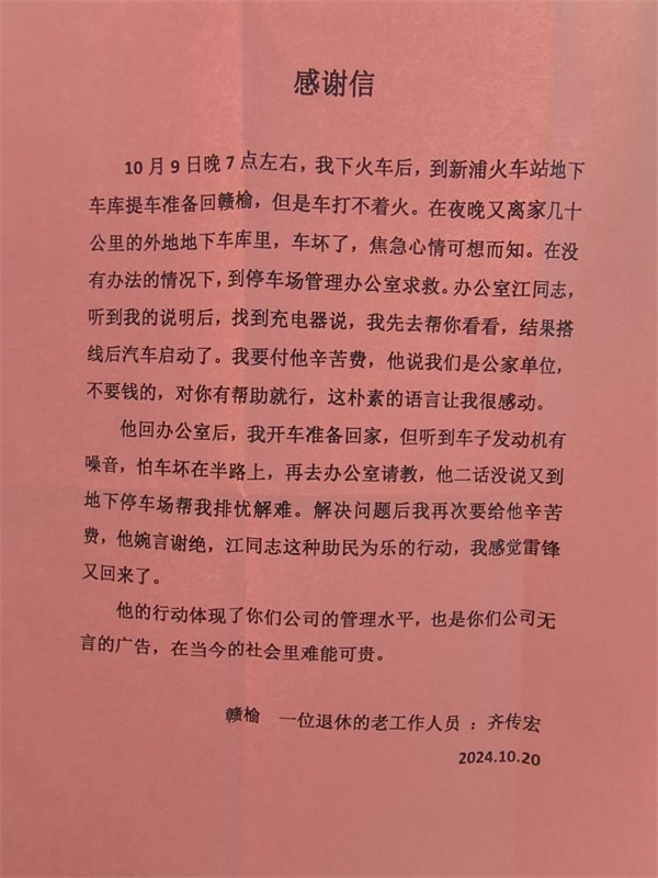 在10月9日晚7點左右,齊先生到綜合客運樞紐地下停車場提車準備回贛榆,但車打不著火,向停車場管理辦公室求救,公司職工江波立即伸出援手,不但幫助齊先生車子發(fā)動成功,還幫助解決了車子其他問題,他不求回報的熱心舉動溫暖了齊先生的回家之路。