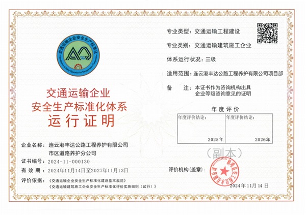 近日,豐達(dá)公司市區(qū)道路養(yǎng)護(hù)分公司順利通過江蘇省交通運(yùn)輸協(xié)會(huì)認(rèn)定,被評(píng)為交通運(yùn)輸企業(yè)安全生產(chǎn)標(biāo)準(zhǔn)化建設(shè)三級(jí)企業(yè)。