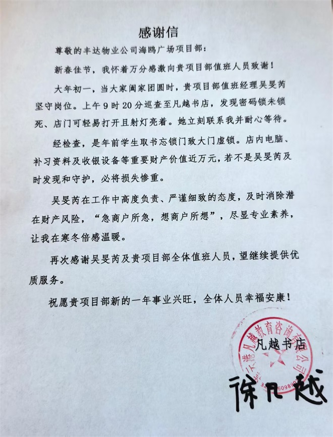 項目部值班經(jīng)理吳旻芮按照春節(jié)安全巡查要求,對廣場區(qū)域開展例行巡檢。行至凡越書店門口時,她敏銳發(fā)現(xiàn)該門店密碼鎖未完全鎖死,店門可輕易推開。經(jīng)現(xiàn)場查看,店內(nèi)空無一人,射燈仍處于開啟狀態(tài),店內(nèi)存放有電腦、收銀設(shè)備及各類學(xué)習(xí)資料,一旦發(fā)生意外,商戶將面臨較大財產(chǎn)損失。發(fā)現(xiàn)隱患后,吳旻芮第一時間聯(lián)系書店負責(zé)人,說明現(xiàn)場情況,并主動留在現(xiàn)場值守看護。約 15 分鐘后,書店負責(zé)人趕到現(xiàn)場。經(jīng)核實,因節(jié)前學(xué)生取書后疏忽大意,導(dǎo)致店門虛鎖未關(guān)??吹轿飿I(yè)人員全程堅守、認真負責(zé),書店負責(zé)人連連致謝,對豐達物業(yè)公司的專業(yè)服務(wù)和責(zé)任擔(dān)當(dāng)贊不絕口。