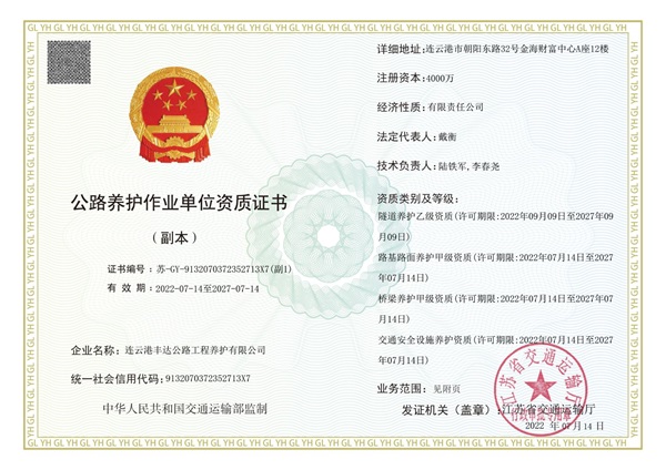 ? ? ? ?目前,豐達(dá)公司已獲得隧道乙級、路基路面養(yǎng)護(hù)甲級、橋梁養(yǎng)護(hù)甲級、交安設(shè)施養(yǎng)護(hù)四項(xiàng)資質(zhì),實(shí)現(xiàn)了養(yǎng)護(hù)業(yè)務(wù)范圍的不斷拓展和延伸。下一步公司將持續(xù)發(fā)力,不斷優(yōu)化資質(zhì)體系,提高養(yǎng)護(hù)作業(yè)能力和水平,為企業(yè)長遠(yuǎn)發(fā)展打下堅(jiān)實(shí)基礎(chǔ)。
