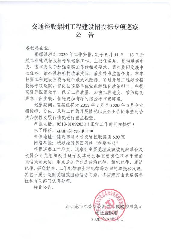 交通控股集團工程建設招投標專項巡察公告