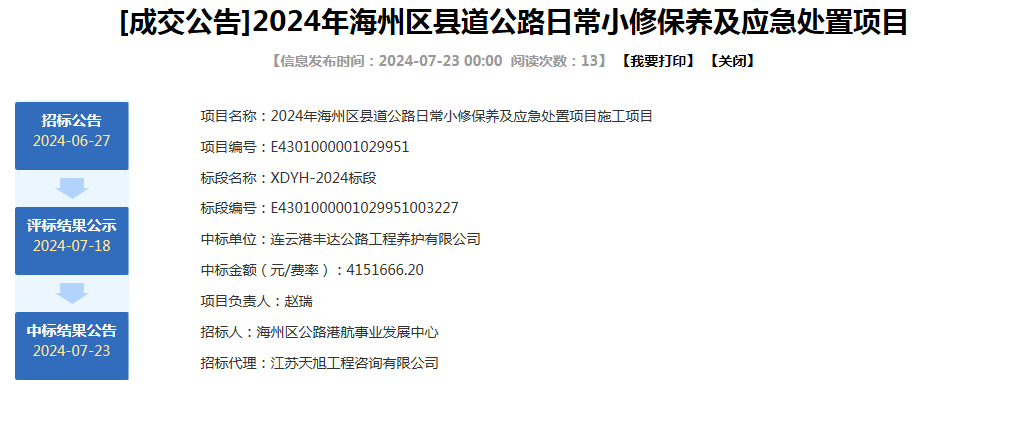 近日,豐達(dá)公司成功中標(biāo)2024年海州區(qū)縣道公路日常小修保養(yǎng)及應(yīng)急處置項(xiàng)目,中標(biāo)金額415萬(wàn)元,工期12個(gè)月。